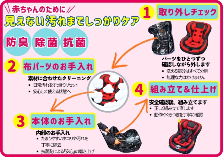 気になるシミや食べこぼし、奥に入り込んだ砂汚れまで丸ごとキレイに仕上げます。